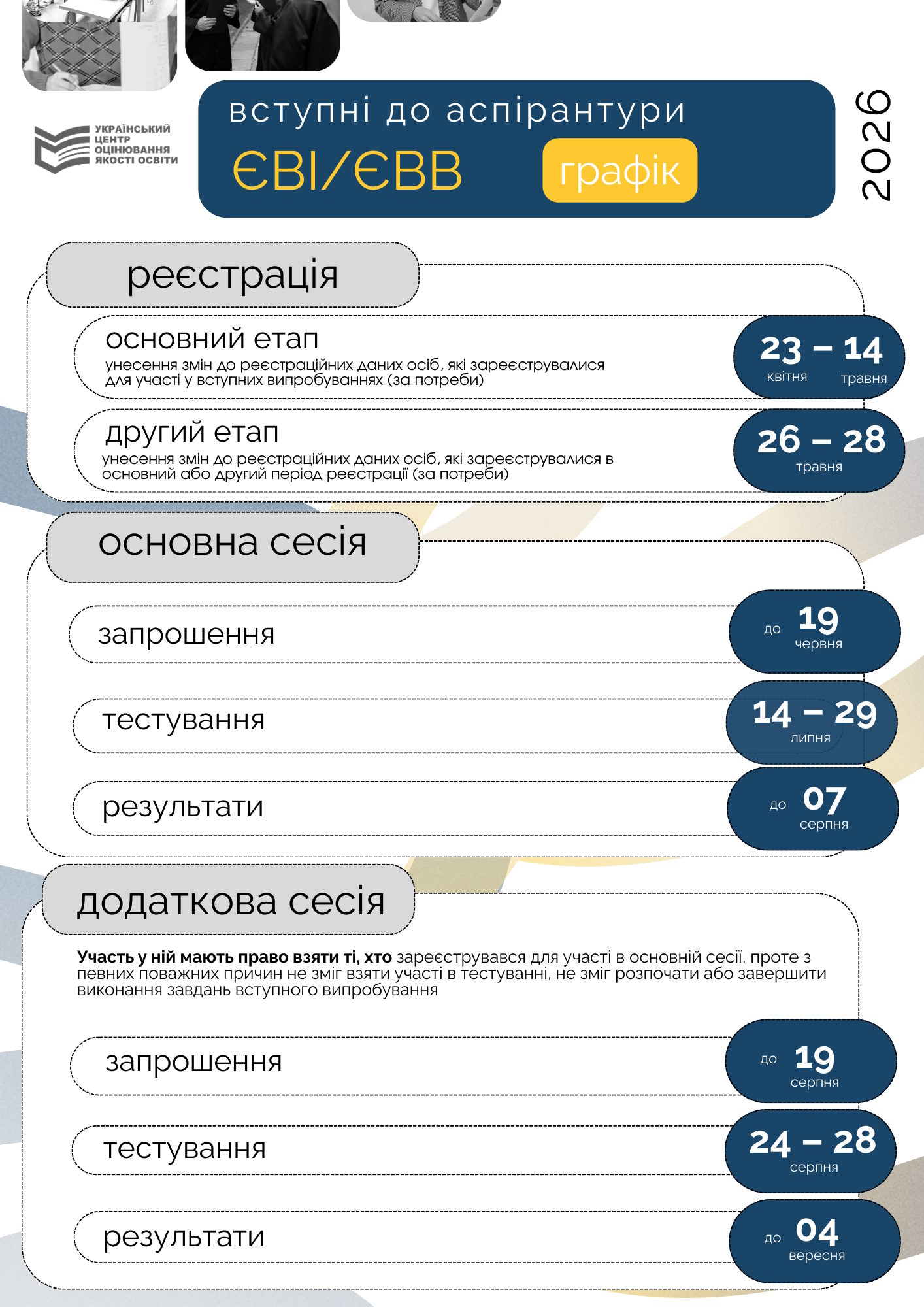 Реєстрація осіб, які бажають взяти участь у ЄВІ / ЄВВ здійснюється Приймальною комісією НаУОА з 23 квітня до 14 травня 2026 року.
